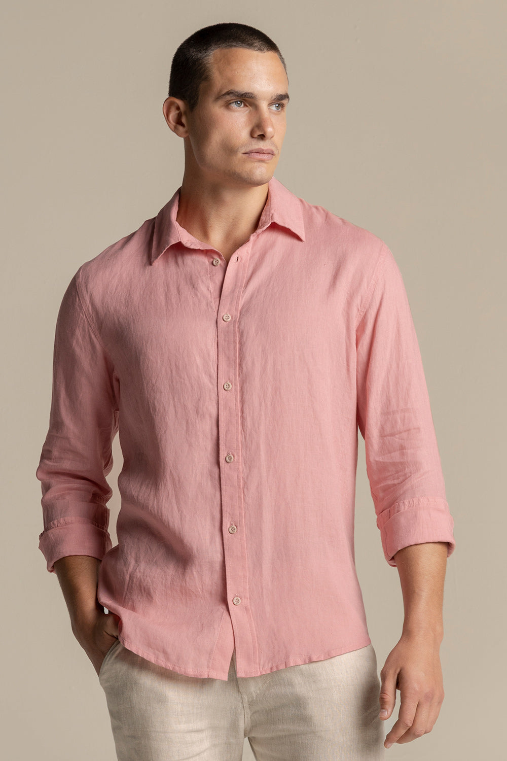 Camisa Canaria en lino rosado. Manga larga, slim fit, cuello clásico y pinzas en espalda. Color rosado, Ref. SH58R61