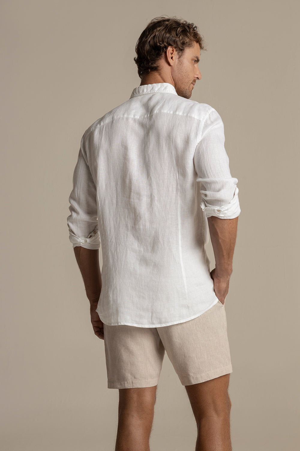 Camisa canaria en lino, manga larga silueta ajustada con pinzas en espalda, cuello clásico y botones en cuello. Color blanco, Ref. SH02091