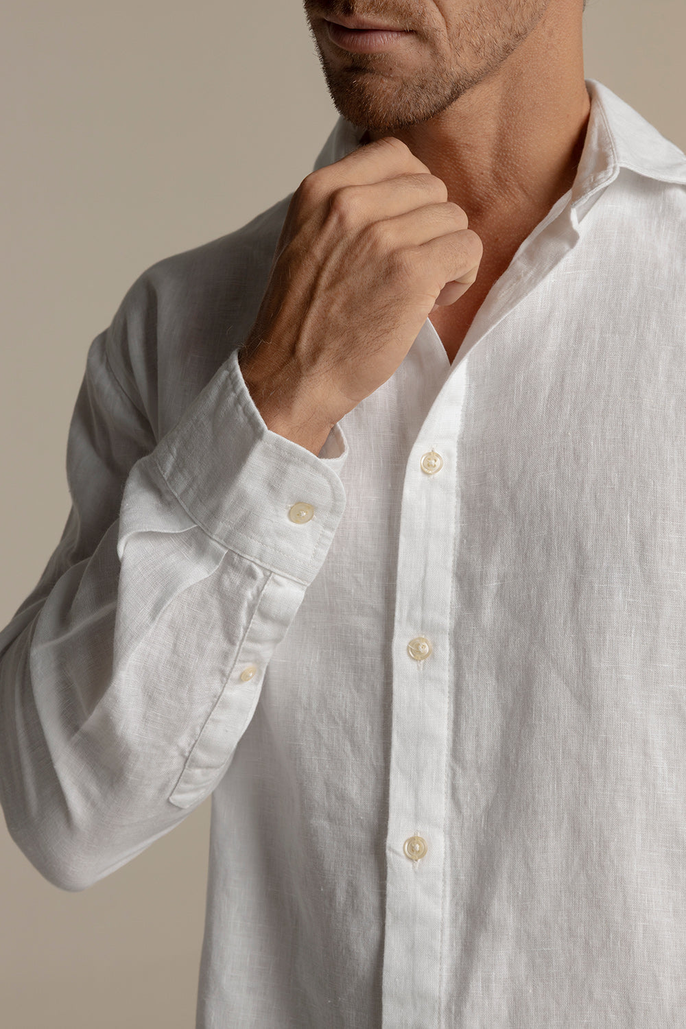 Camisa fiji en lino, manga larga, silueta ajustada con pinzas en espalda y cuello clásico. Color blanco, Ref. SH71031