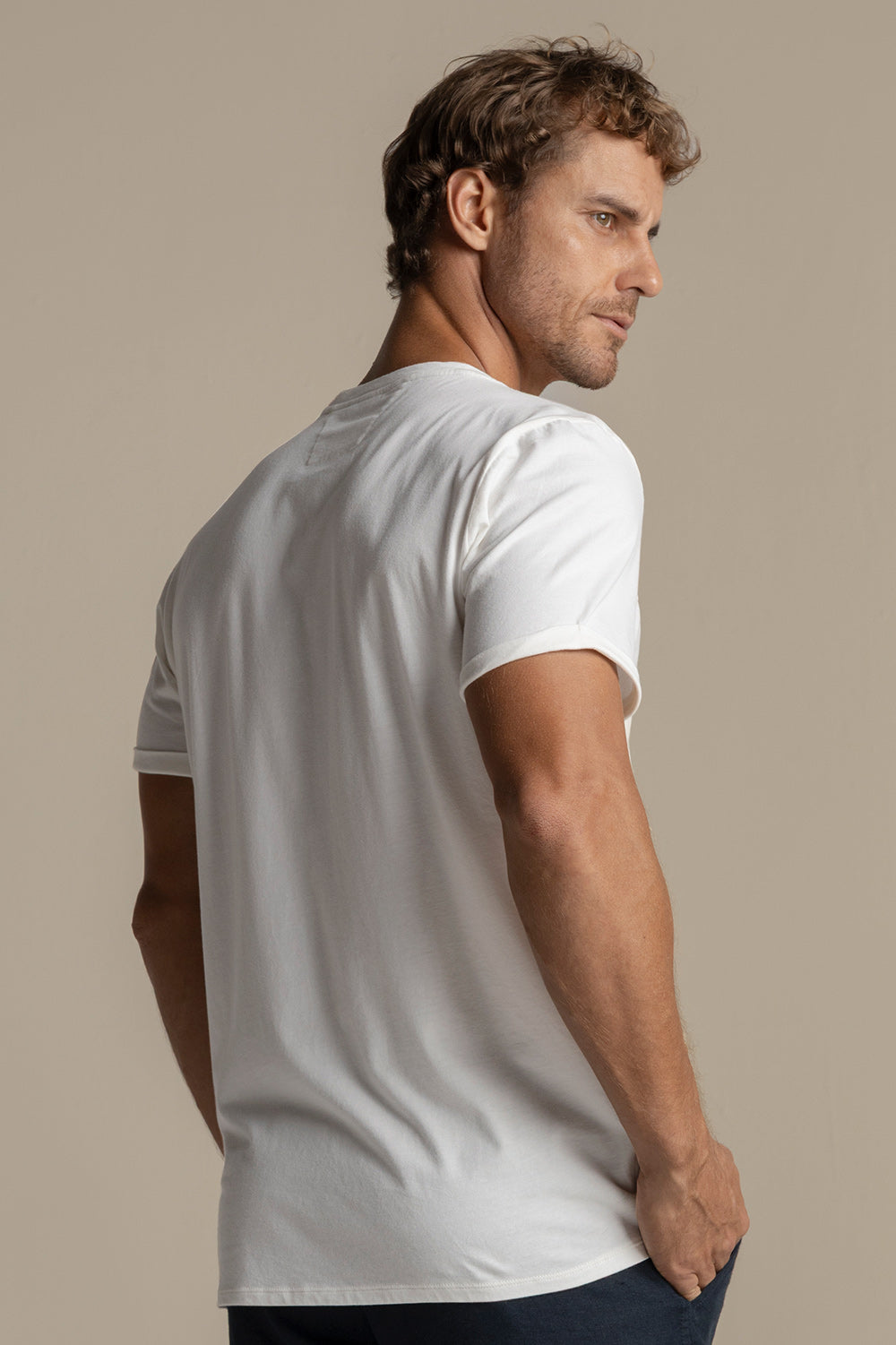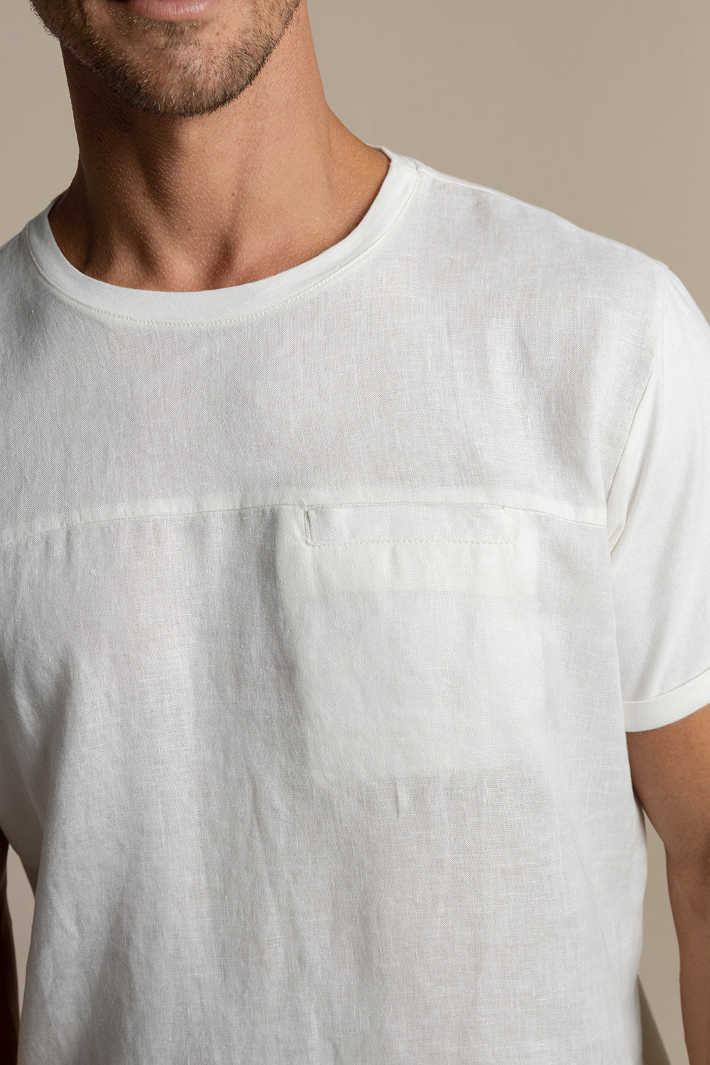 Camiseta jamaica con frente en lino, espalda y mangas en algodón, manga corta y bolsillo de ribete en frente. Color blanco, Ref. SH06001