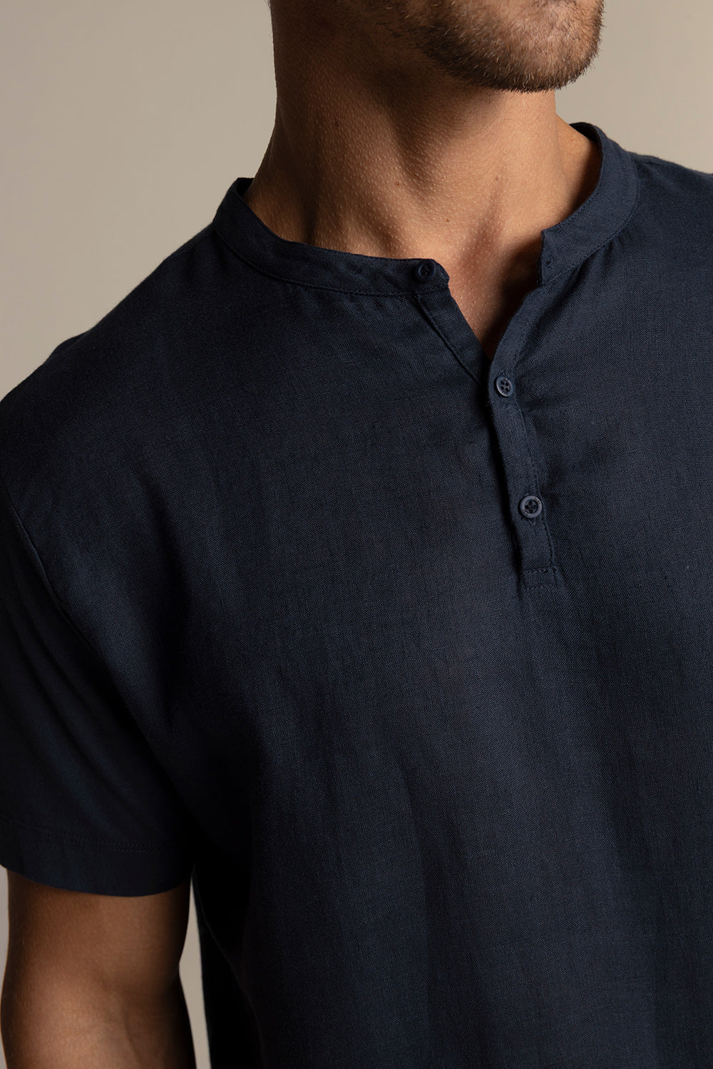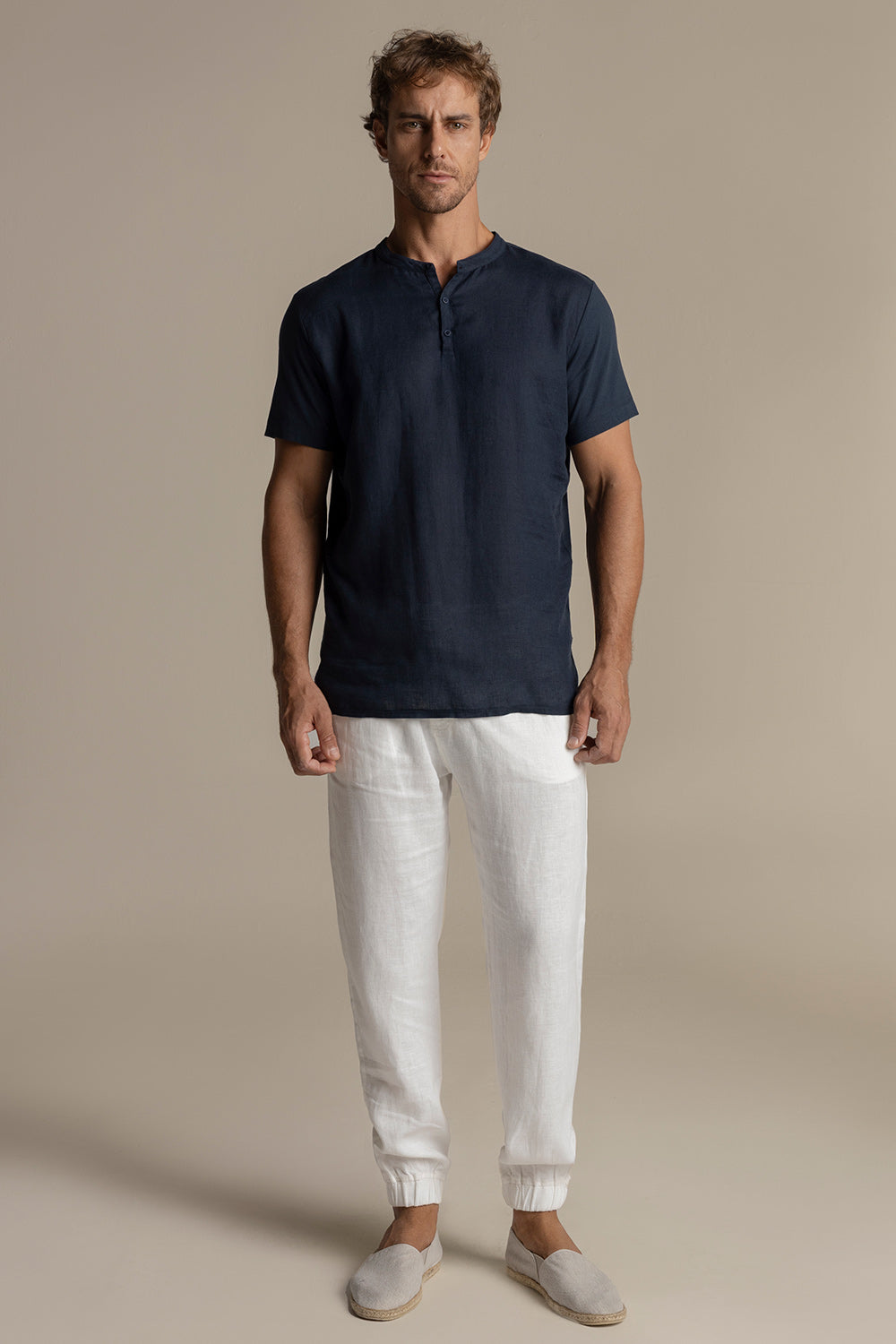 Camiseta cuba con frente en lino, espalda y mangas en algodón, manga corta y cuello nerú. Color blanco, Ref. SH38A41