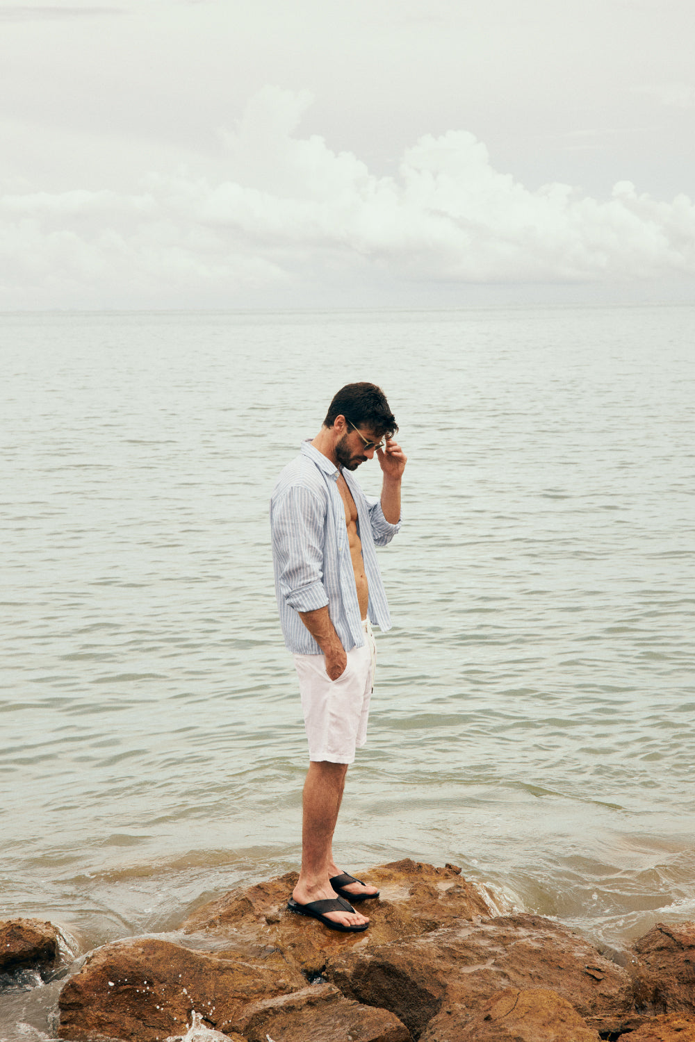 Camisa en lino de rayas preteñidas azules, manga larga, relaxed fit y cuello clásico. Color caqui/negro, Ref. SH92062