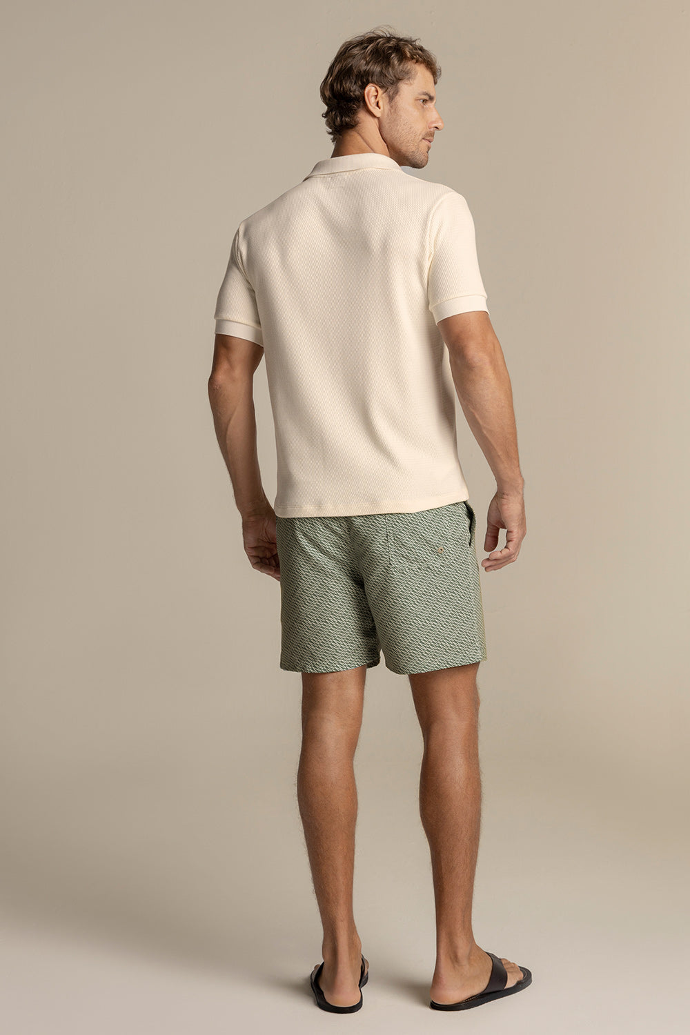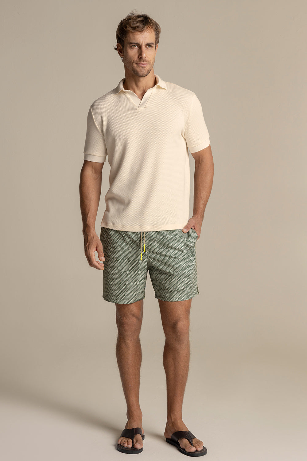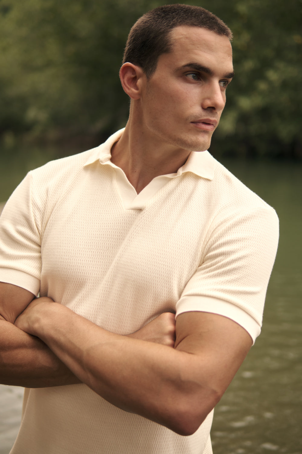 Camiseta polo en algodón tejido de punto. Manga corta, classic fit, con puños, cuello y perilla en tejido rectilíneo. Color marfil, Ref. SH46B61