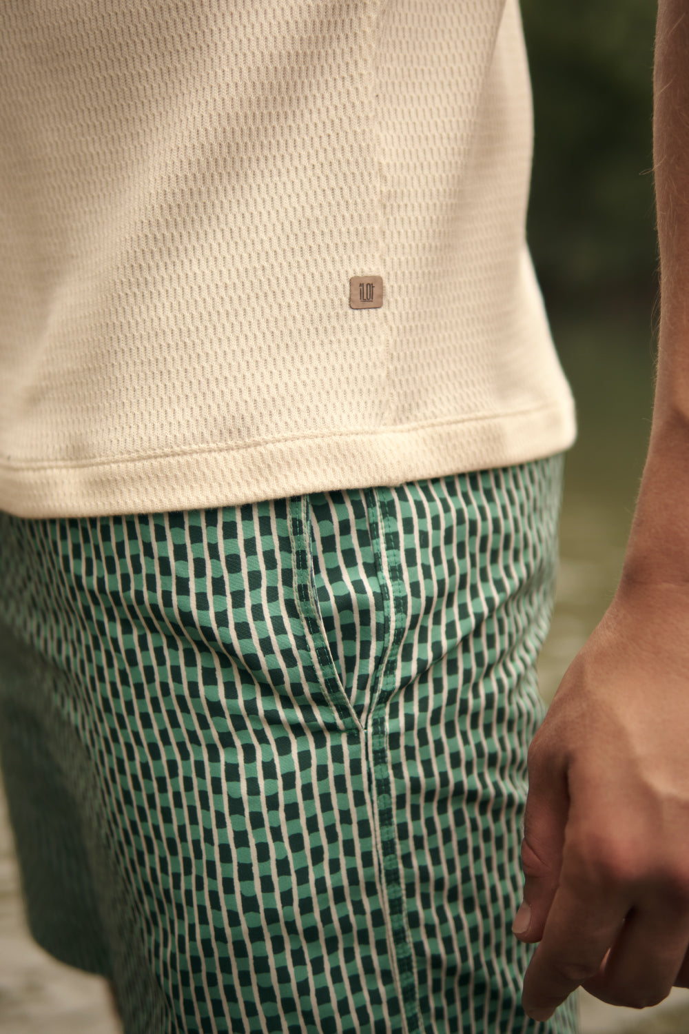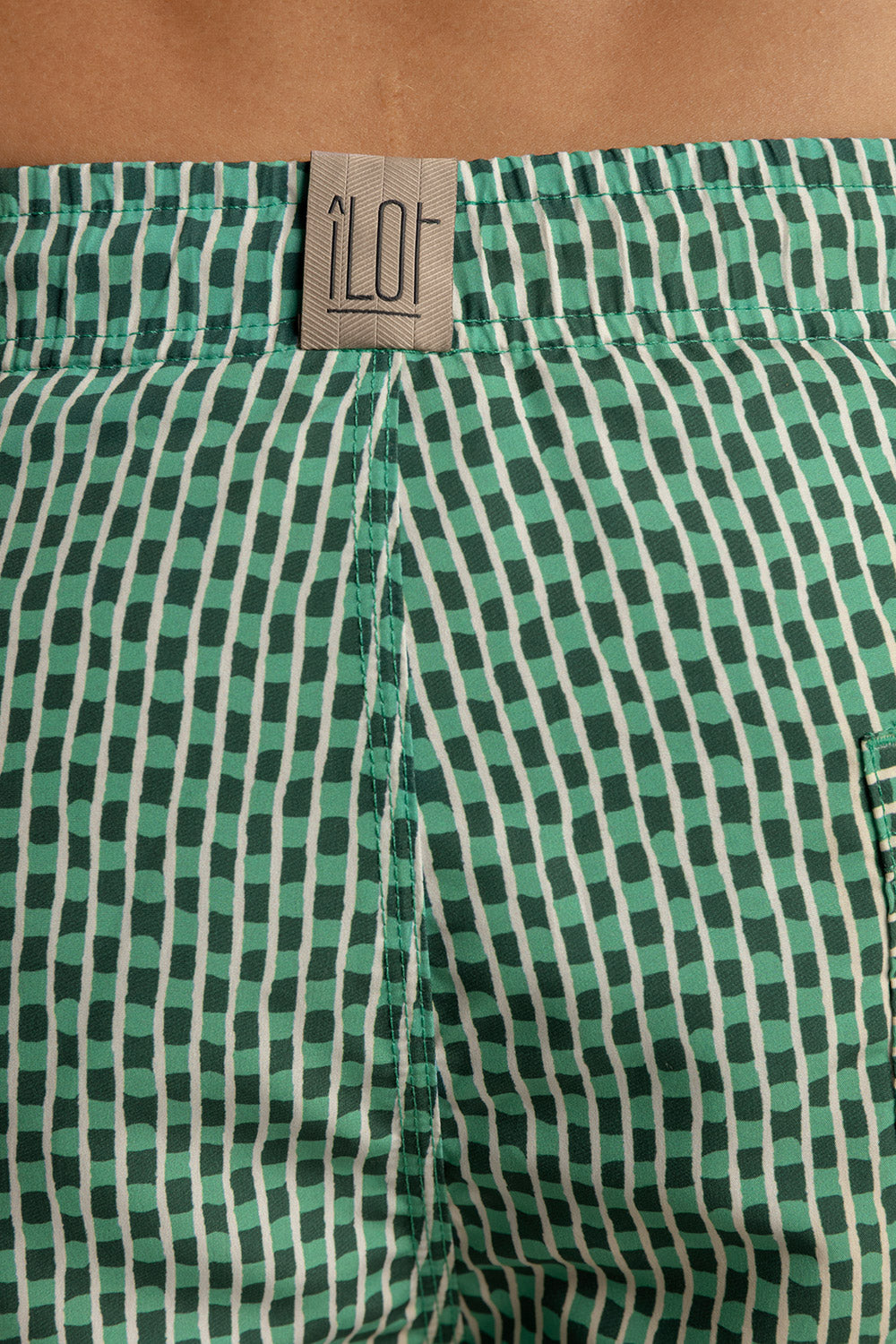 Pantaloneta Bahía corta, estampado geométrico verde. Silueta clásica con elástico en la cintura y cordón off white con punteras metálicas en negro mate. Ojaletes en negro mate y bolsillo de parche. Color verde/marfil, Ref. CH23061-MH23061-LH23061