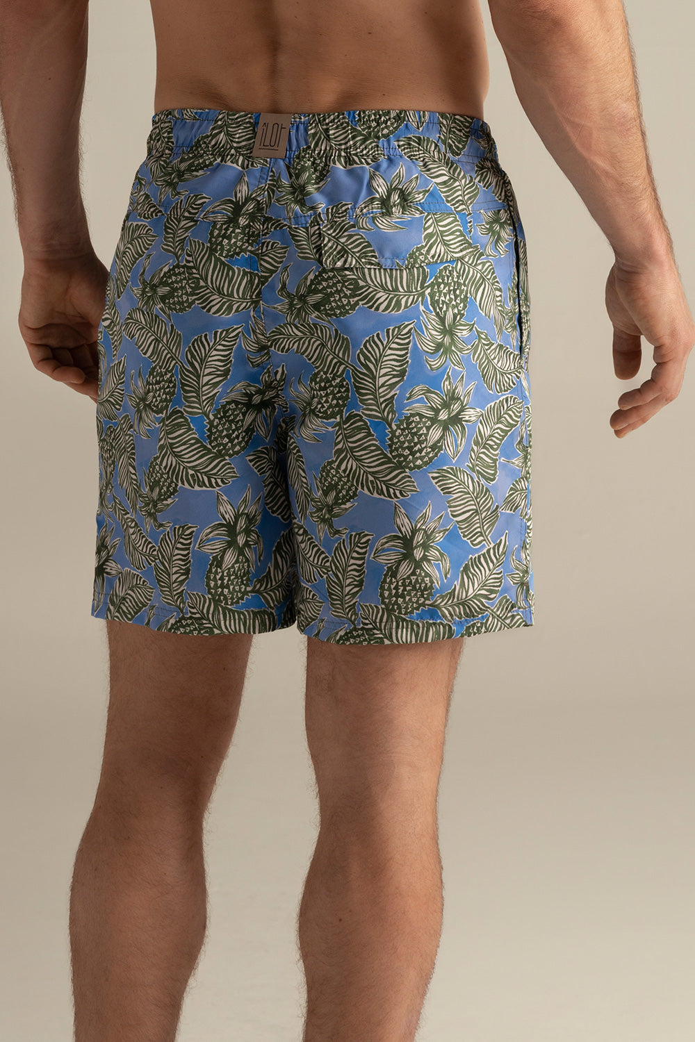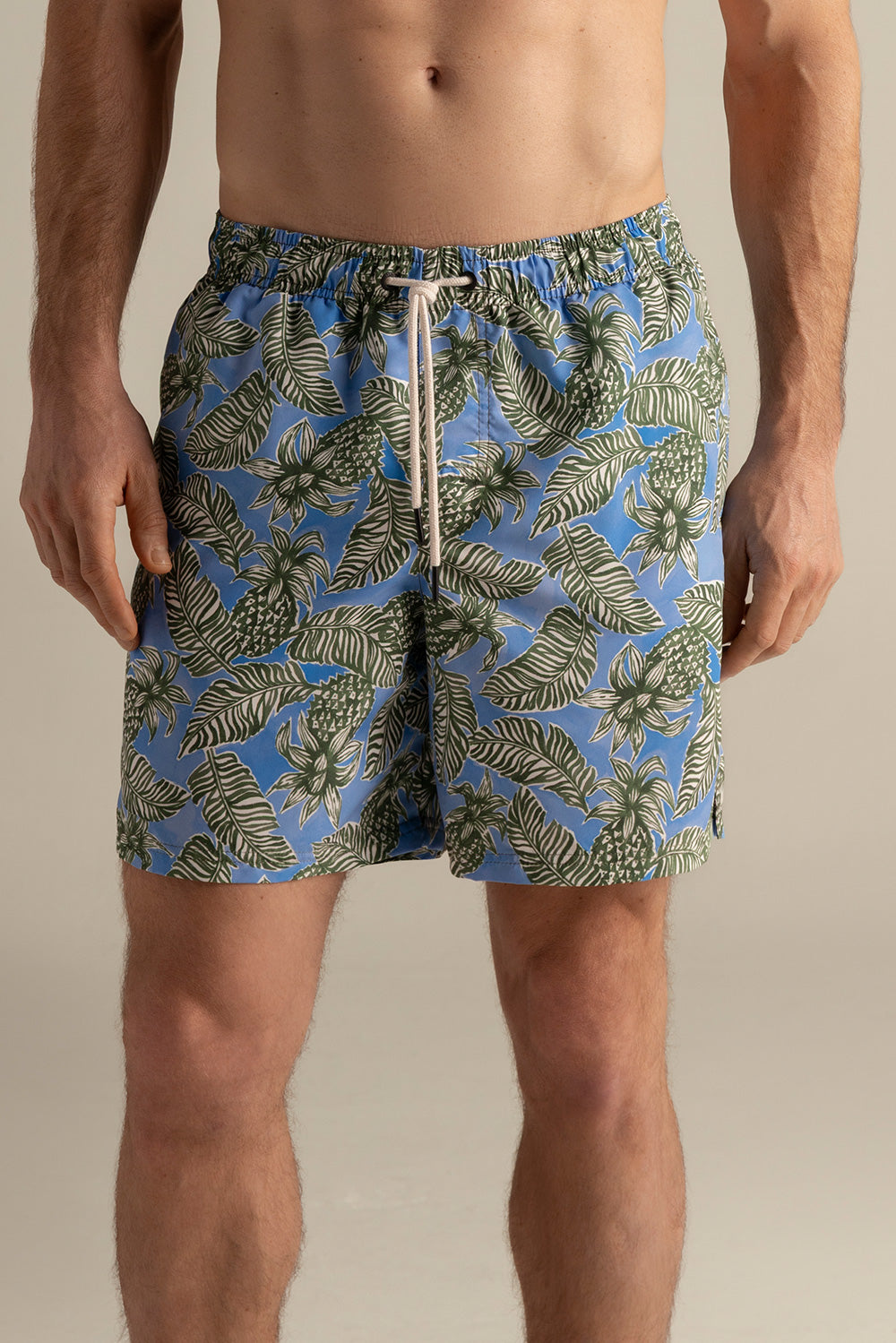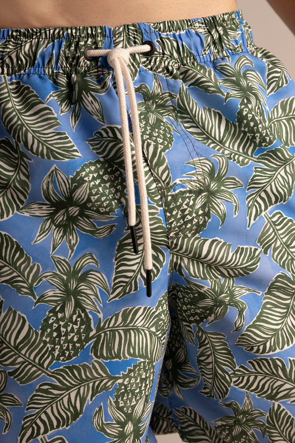 Pantaloneta Península corta, con estampado de piñas y hojas azules. Silueta clásica con elástico en la cintura y cordón off white con punteras metálicas en negro mate, ojaletes en negro mate en zamack y bolsillo de tapa.. Color azul/verde, Ref. CH37062-MH37062-LH37062