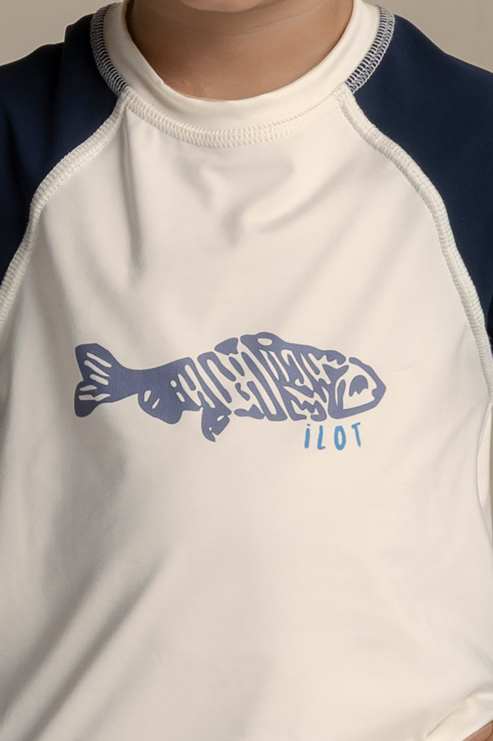 Camiseta Kids en lycra con estampado de Îlot y mangas raglán en azul oscuro. Color off white/azul, Ref. LK09A61