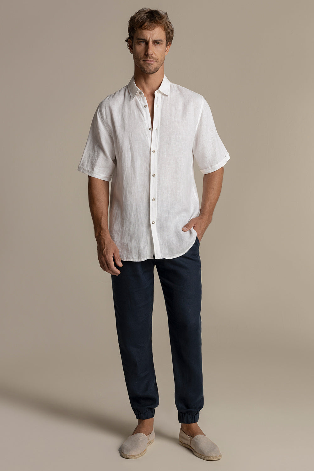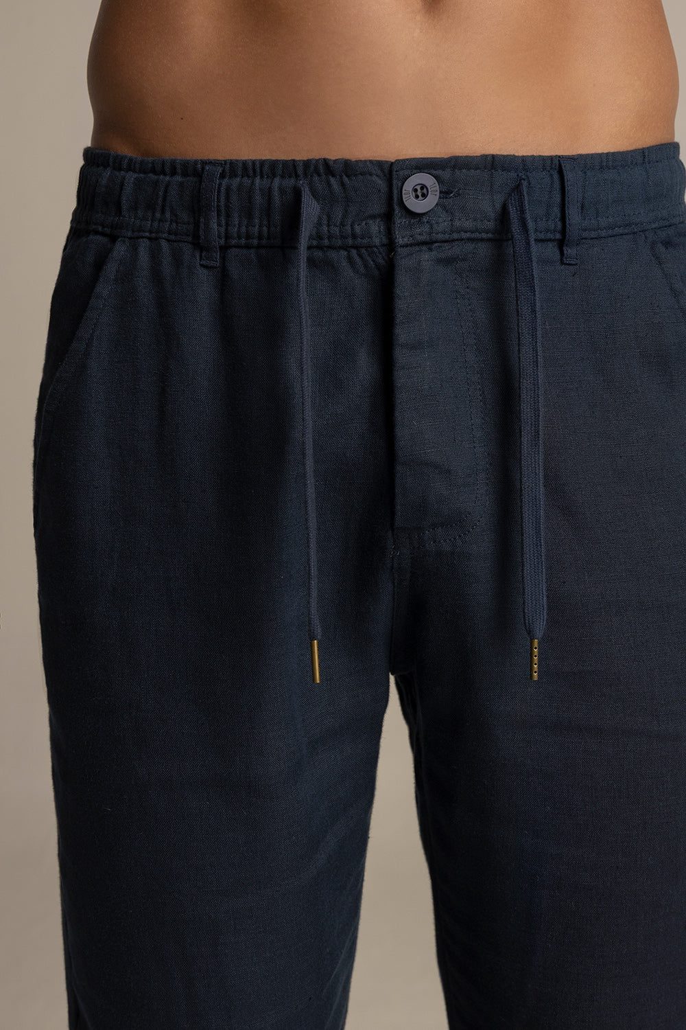 Pantalón jogger duna en lino, silueta relajada, cintura enresortada, pasadores, botón para ajuste en cintura, bolsillos laterales y bolsillos de ribete traseros. Color azul oscuro, Ref. PH16A21