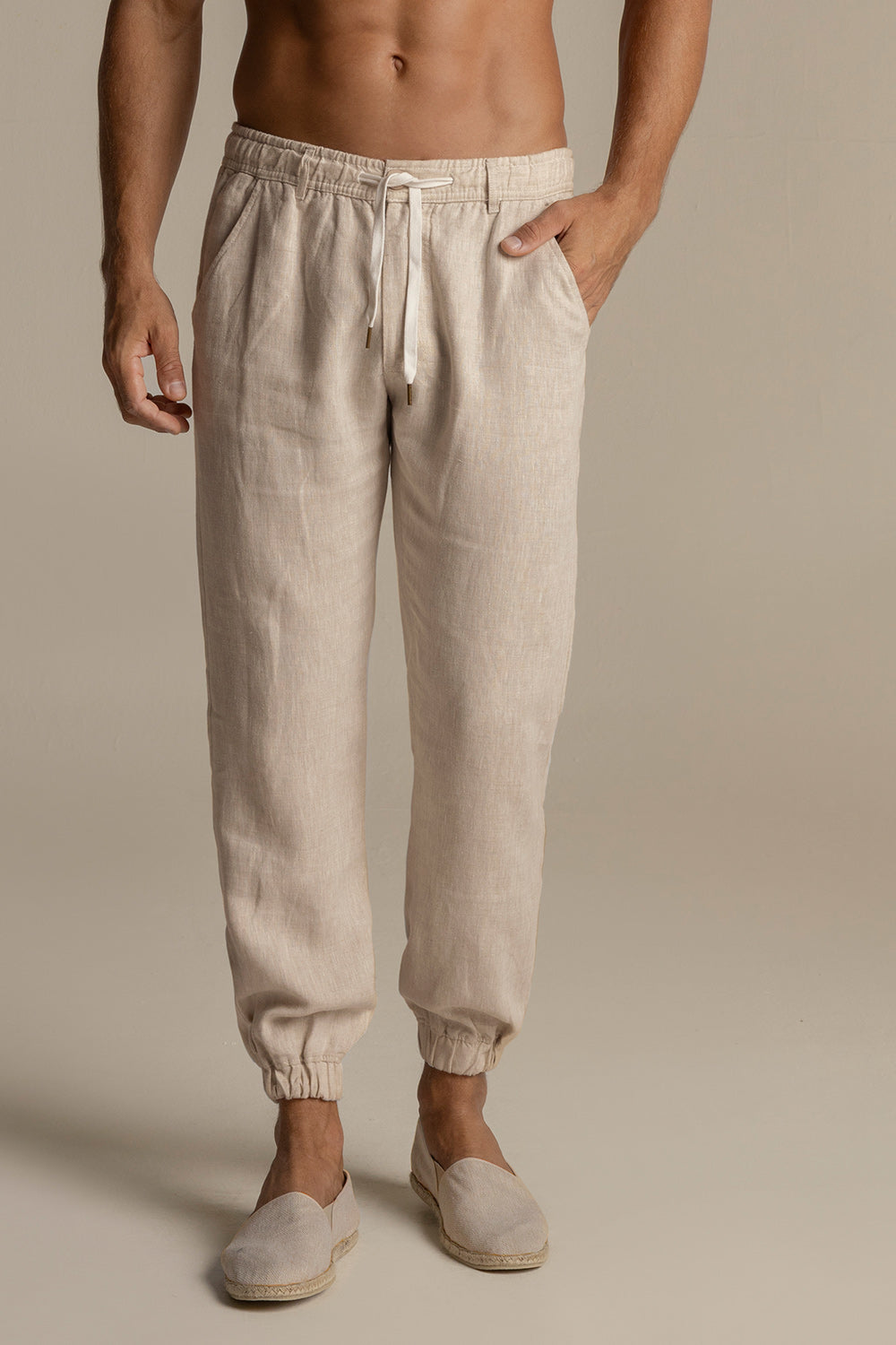 Pantalón jogger duna en lino, silueta relajada, cintura enresortada, pasadores, botón para ajuste en cintura, bolsillos laterales y bolsillos de ribete traseros. Color caqui, Ref. PH16K21
