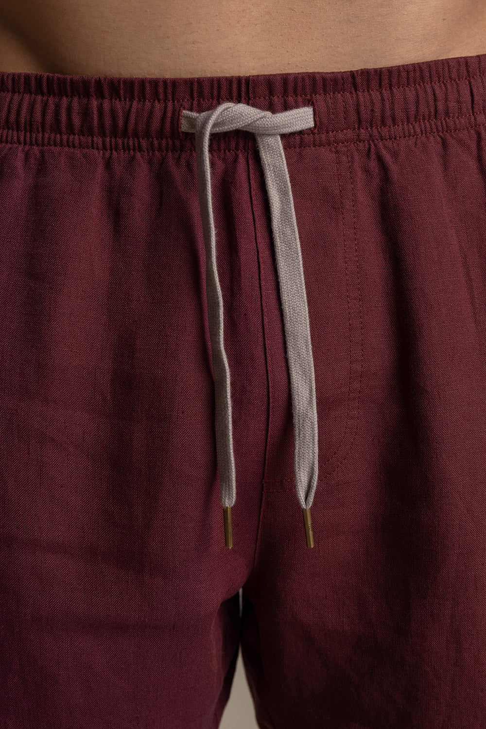 Short en lino vinotinto. Classic fit, bolsillos laterales, cintura enresortada con cordón, bolsillo de parche posterior y guardapolvo. Color vinotinto, Ref. BH63V61